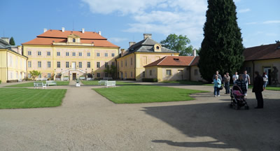 Nach dem üppigen Morgenmahl am alten Schloss „Krasny Dvur“ lustwandeln wir auf maigrünen Wiesen und genießen im englischen Park die Natur und bestaunen die alten Bäume. |